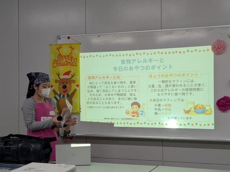 子育てサロン「まなびー」特別プログラム「親子で楽しむ クリスマス・スイーツタイム!」を12月25日、有瀬キャンパス栄養学部棟において開催しました。当日は、就学前の子どもとその保護者12組26人が参加しました。