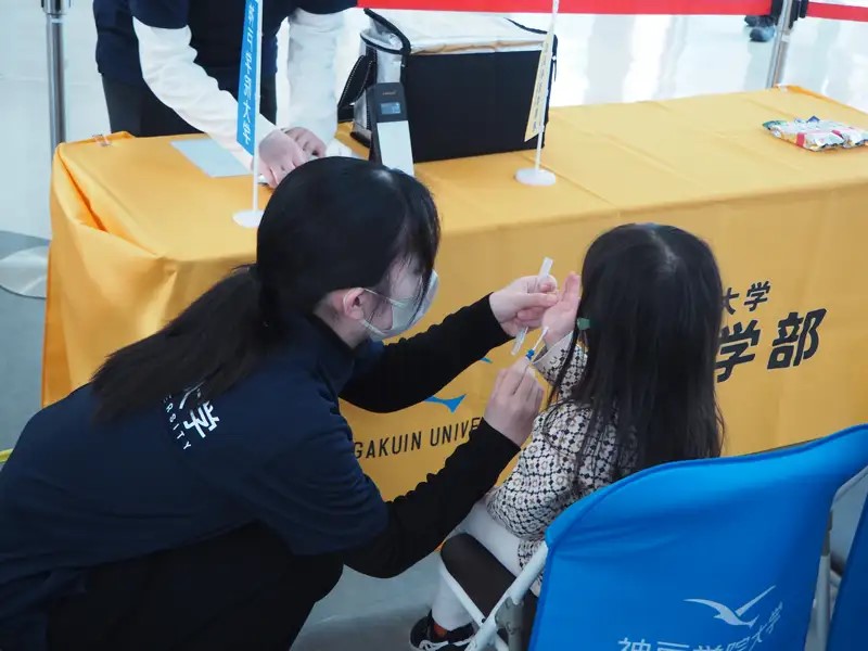 ブースでは、「手洗いチェック」「骨の健康チェック」「血管の健康チェック」の3種類の健康チェックを行いました。各ブースでは教員の指導のもと学生が測定・確認を行い、参加者に測定結果の説明や健康を保つためのアドバイスを行いました。