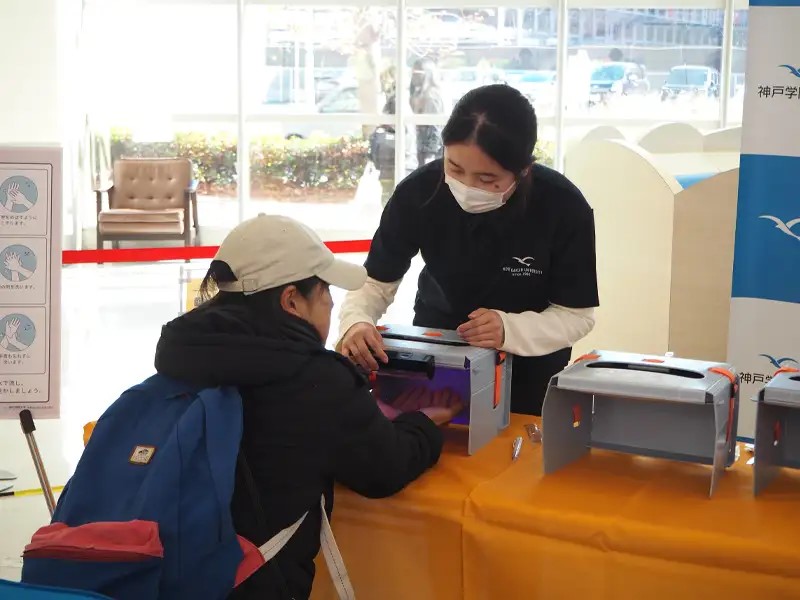 ■手洗いチェック ウェットティッシュを使用した手の汚れのふき取りや、正しい手洗い方法を学生がレクチャーしました。汚れは親指まわりや爪のまわり、指先などに残りやすいことを参加者に伝えながら、実際に手洗いを実践し、ブラックライトで照らすことで手のどの部分に洗い残しがあるのかを確認しました。また、参加者は測定器を用いてウェットティッシュでふく前後で手に付着した汚れがどのように変化したか確認しました。