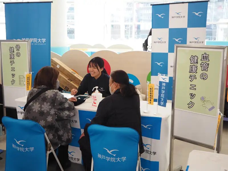 栄養学部の竹橋正則教授、伊藤智講師、兵頭香苗助教と同学部栄養学科臨床検査学専攻の学生5人が、12月23日にイオン明石ショッピングセンターで開催された「イオンモールde健活」にブースを出展しました。